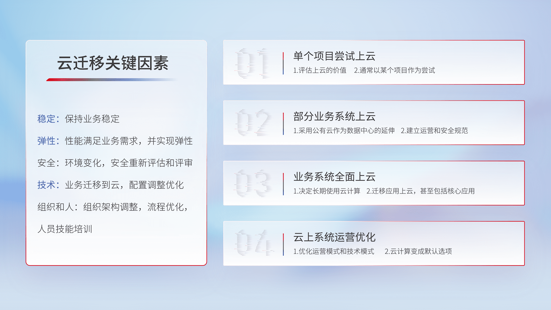 结合实际业务,,,从规划设计、、云平台选型、、云原生改造、、、数据迁移、、、集成交付,,,,迁移全过程为客户识别最佳上云路径,,,,做好风险识别管理,,设计网络架构、、、、身份权限、、、安全审计合规、、操作审计、、日志审计、、监控告警策略、、多站点容灾设计等,,,对云上基础设施进行整体规划,,提升IT治理水平,,,以满足弹性、、、高可用、、、、高性能的需求。。。。