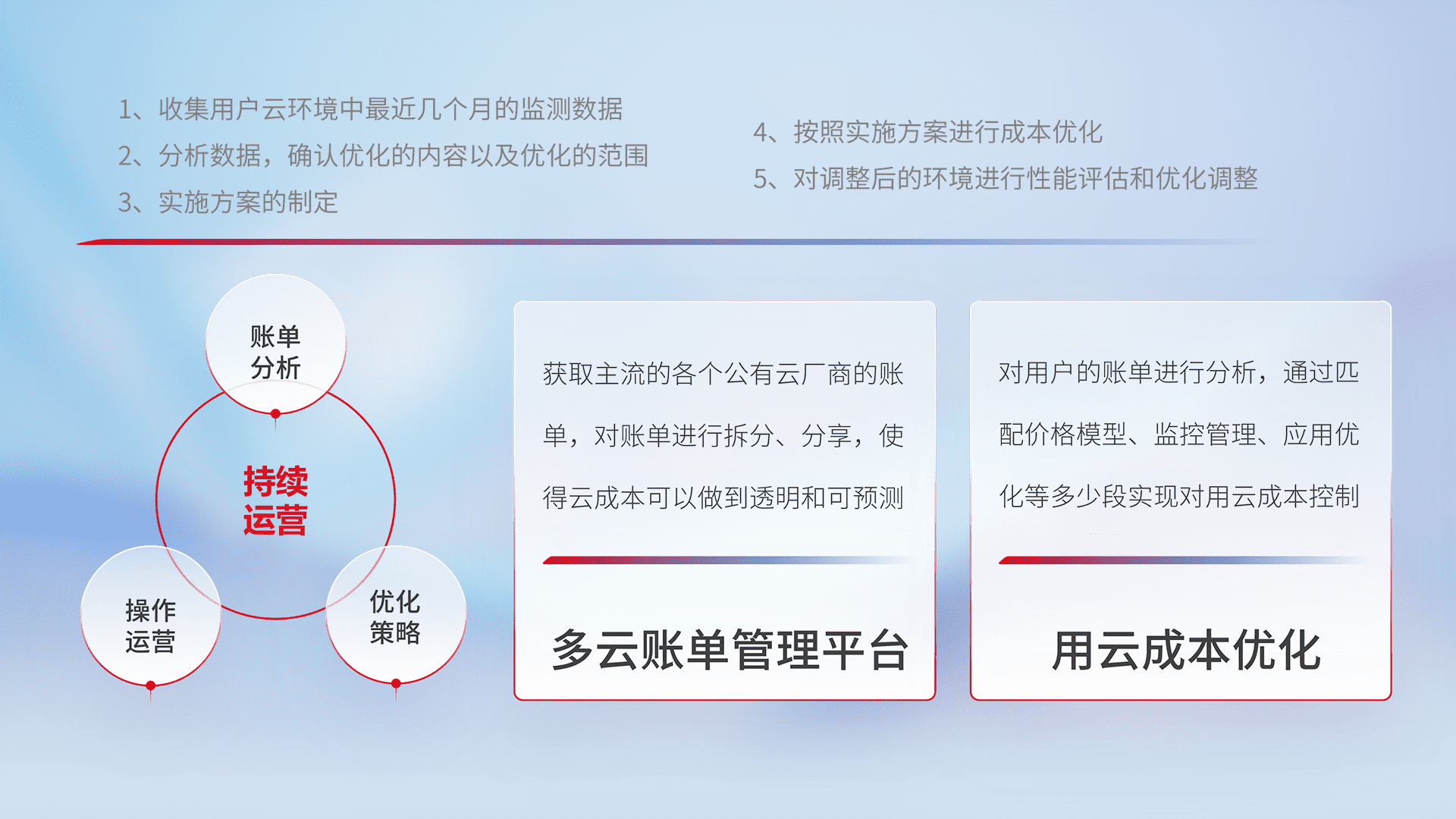 通过多云纳管,,,以统一的资源数据模型把客户的云资源进行抽象和封装,,,进而实现对多云资源的统一操作,,,保障云资源管理的可靠性、、、稳定性与可用性。。量身定制化运维内容,,,,配置、、、、开发运维、、、补丁管理、、、、备份、、、监控、、、、认证和访问管理、、、、审计和日常巡检等,,,保障在用云过程中的可靠度,,,,稳定度以及高可用率。。